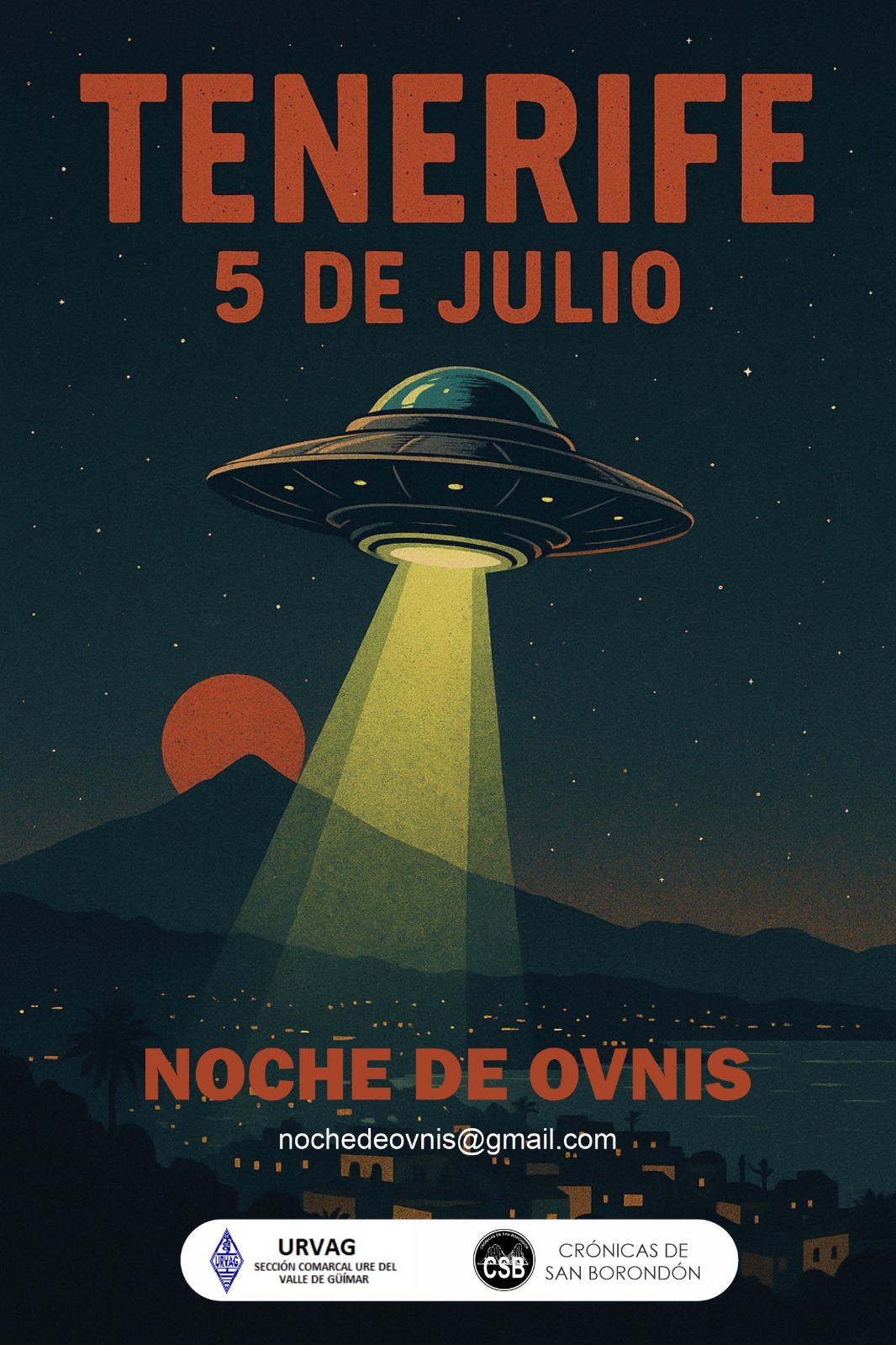 Los aficionados tendrán este sábado 5 de julio, con permiso de la Virgen de los Reyes que celebra su bajada, la ocasión de compartir una velada multimedia con los OVNIs como excusa, y las maravillas del universo como epicentro. Se emitirá en streaming desde los canales en Youtube de Canarias Oculta y URVAG, además de en redes sociales y en las frecuencias de Canarias Radio. Más información en el Whatsapp 657 19 93 11 y el correo nochedeovnis@gmail.com