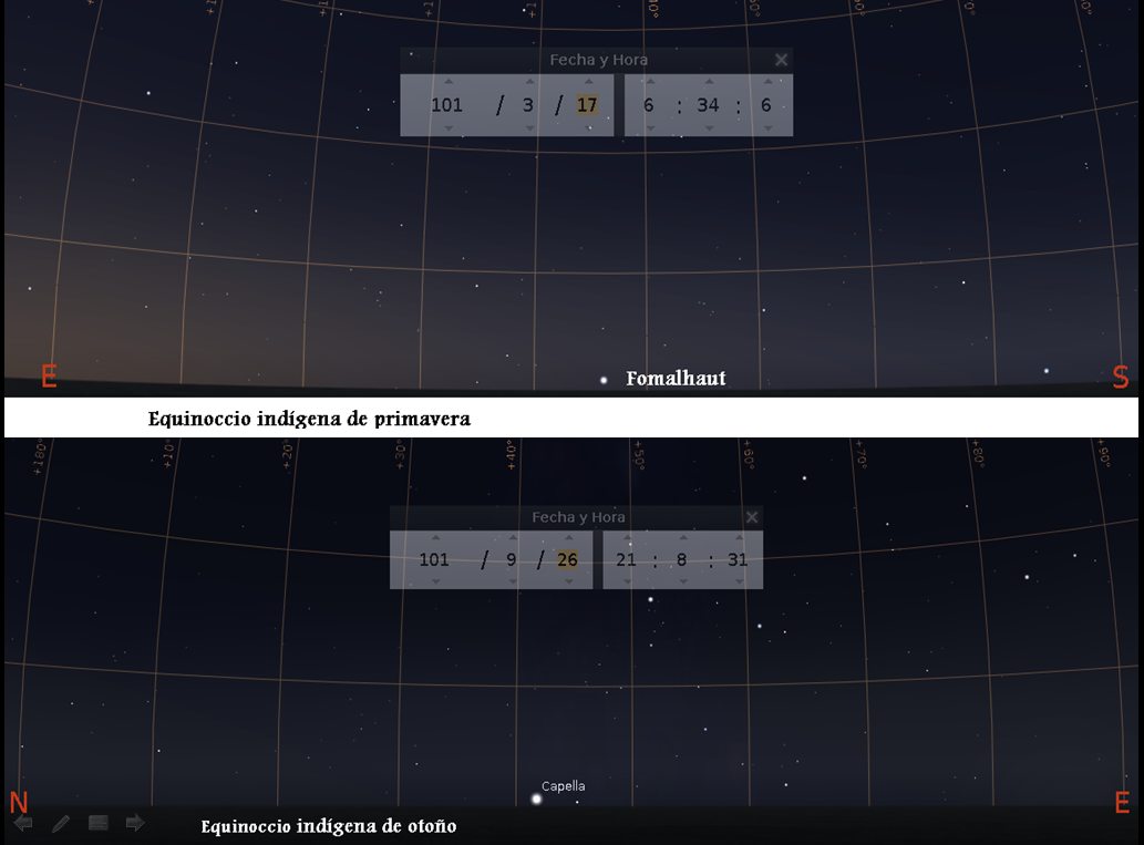 * El “equinoccio indígena de otoño” lo fijaba la estrella Capella (la más resplandeciente de la constelación de Auriga y la sexta más brillante del cielo) durante su aparición en el horizonte justo después de la puesta del sol los días 26 ó 27 de septiembre.
