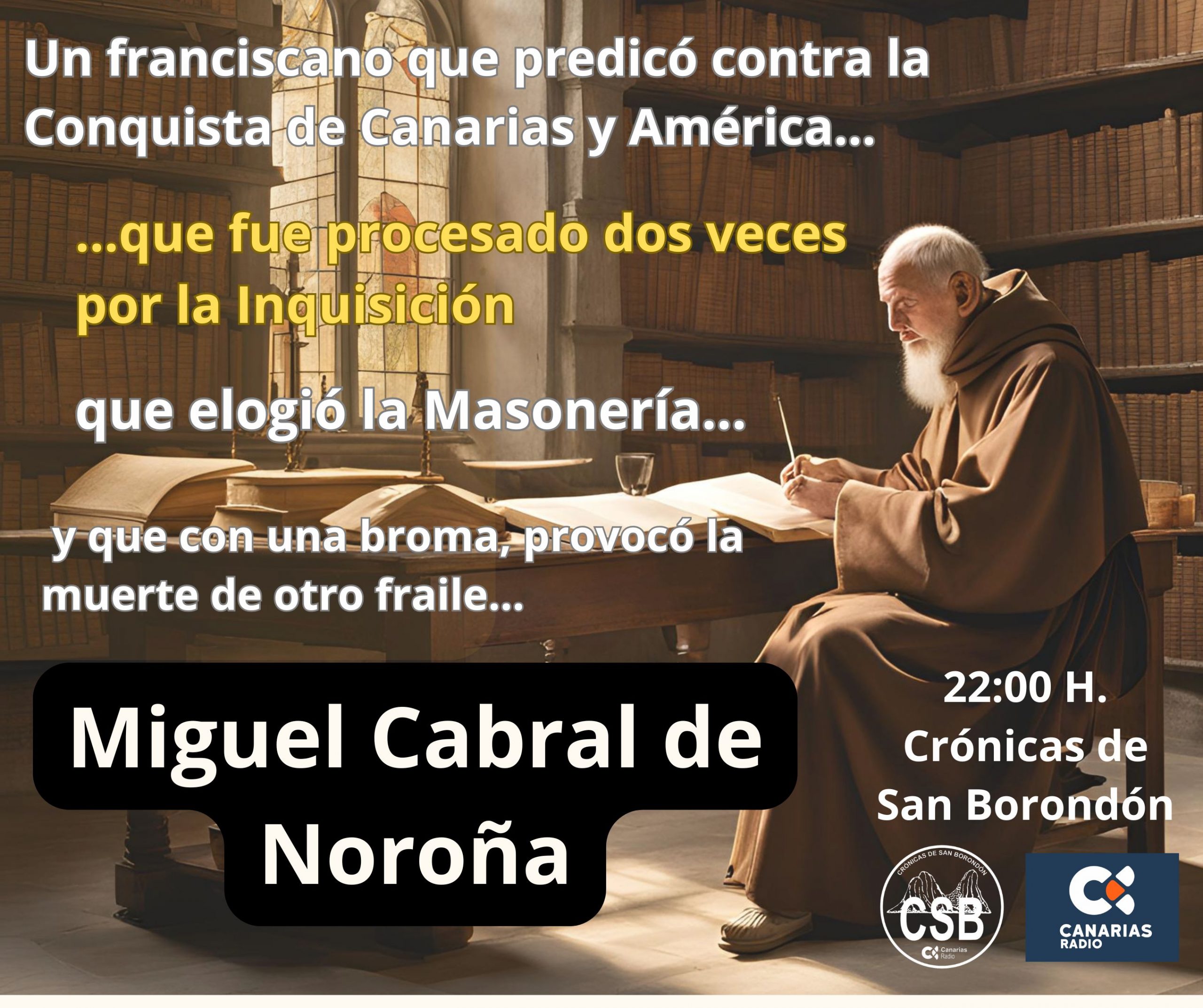 En Crónicas de Prometeo, Miguel Ángel Cabral analizará la tesis de Avi Loev relativa a la existencia de una supercivilización en la Tierra hace millones de años, un escenario de que no habría quedado rastro alguno, y con el historiador Manuel Hernández González trazaremos el perfil de un personaje fascinante, Miguel Cabral de Noroña. Estamos ante un fraile franciscano que abandona su condición de monje y lleva una vida envuelta en peripecias, en escenarios de enorme influencia, y con una potente actividad como escritor. Es llamativo que fuera un pionero en la defensa de la igualdad de las mujeres, que abiertamente denunciará la Conquista de Canarias y América, o que elogiara a la masonería. La Inquisición le procesó por dos veces. Una vida para conocerla.
