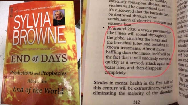 Finalmente, la última de las liebres saltó con la vidente Sylvia Browne, quien en 2008 publicó End of Days: Predictions and Prophecies About the End of the World escribiendo: “Alrededor de 2020, una enfermedad grave similar a la neumonía se extenderá por todo el mundo, atacando los pulmones y los bronquios y resistiendo todos tratamientos conocidos. Casi más desconcertante que la enfermedad en sí será el hecho de que desaparecerá tan pronto como llegue. Atacará de nuevo diez años después, y luego desaparecerá por completo»