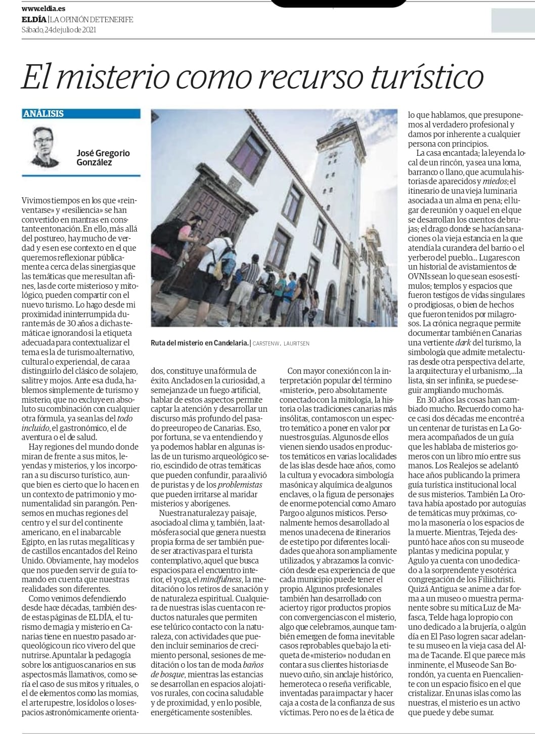 Vivimos tiempos en los que “reinventarse” y “resiliencia” se han convertido en mantras en constante entonación. En ello, más allá del postureo, hay mucho de verdad, y es en ese contexto en el que queremos reflexionar públicamente a cerca de las sinergias que las temáticas que me resultan afines, las de corte misterioso y mitológico, pueden compartir con el nuevo turismo. Lo hago desde mi proximidad ininterrumpida durante más de 30 años a dichas temática, e ignorando si la etiqueta adecuada para contextualizar el tema es la de turismo alternativo, cultural o experiencial, de cara a distinguirlo del clásico de solajero, salitre y mojos. Ante esa duda, hablemos simplemente de turismo y misterio, que no excluye en absoluto su combinación con cualquier otra fórmula, ya sean las del todo incluido, el gastronómico, el de aventura o el de salud.