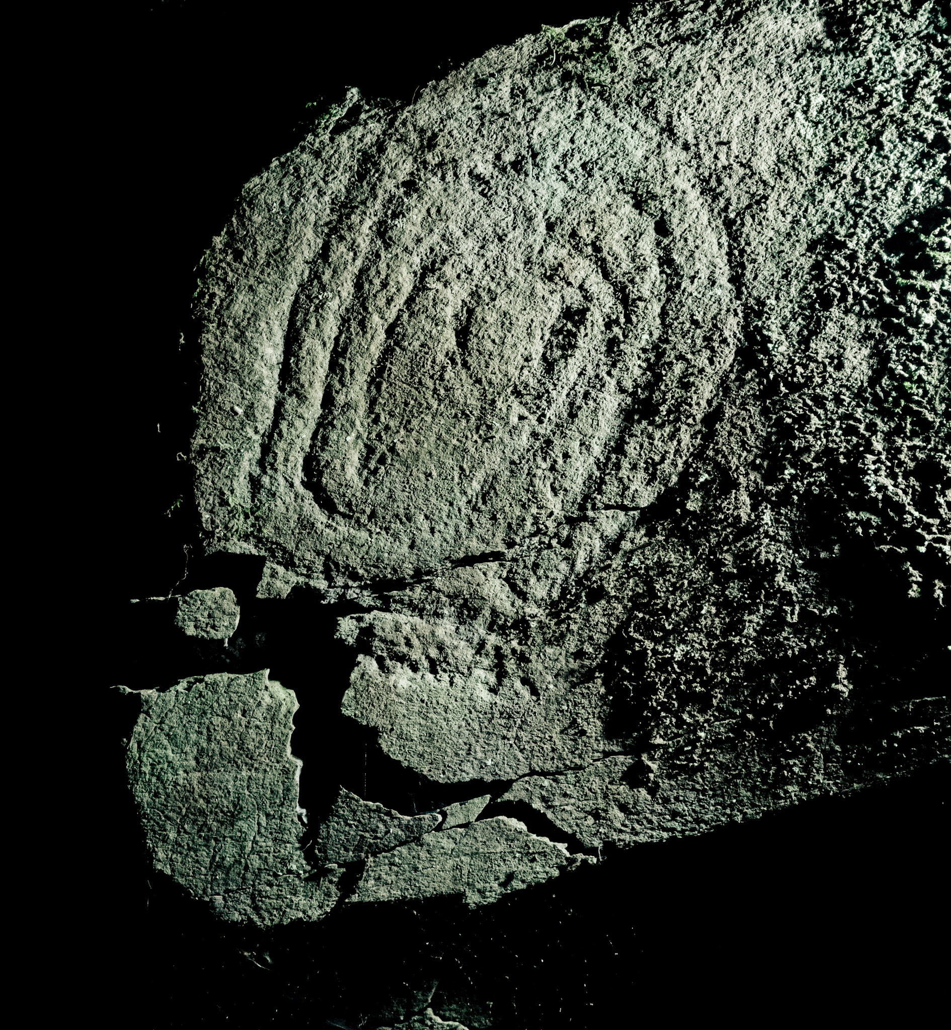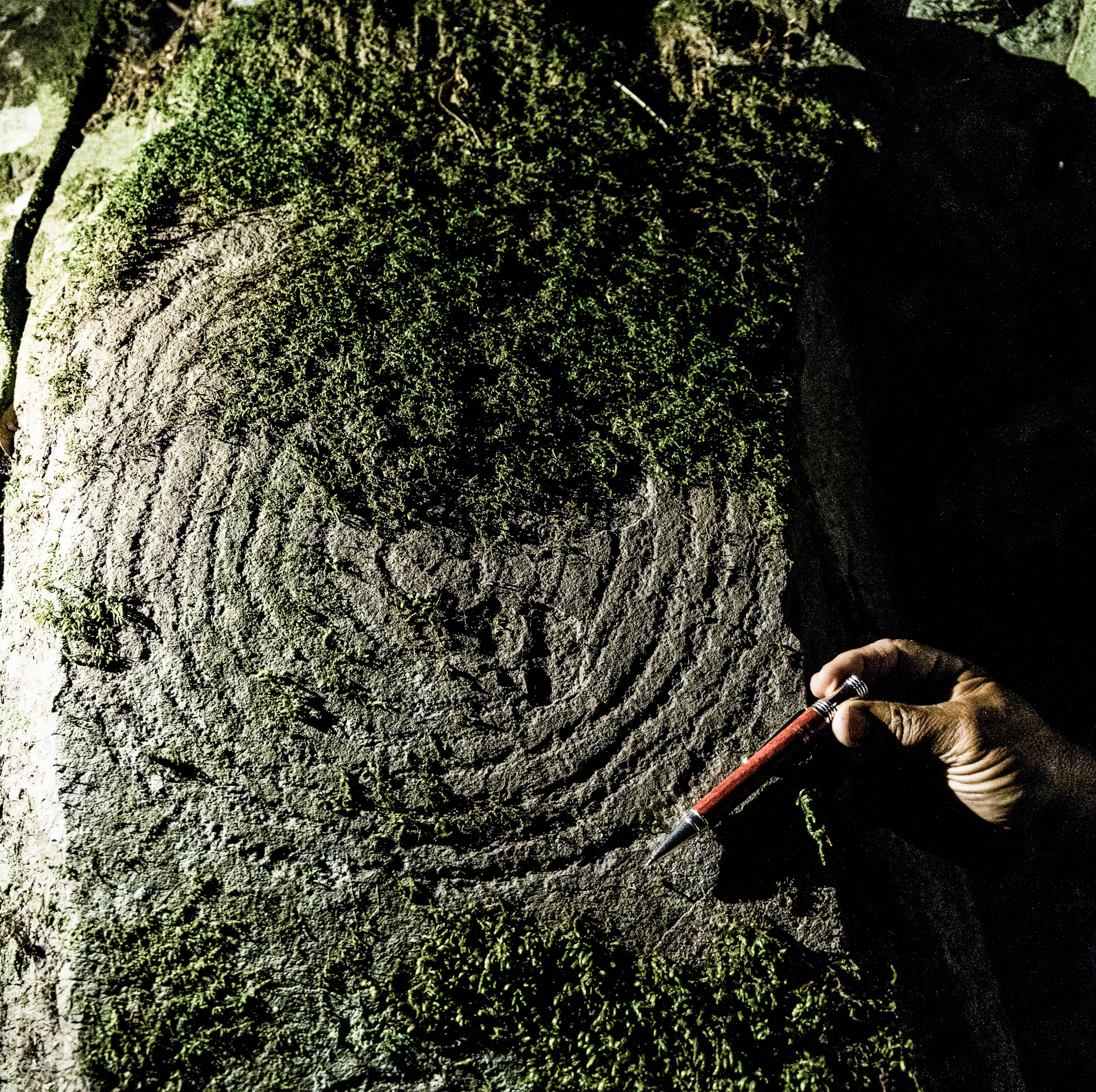 El panel 7 contiene cuatro motivos: espiral de nueve giros, otra de tres giros, un motivo de semicírculos más pequeño y un motivo circular cubierto de musgo.