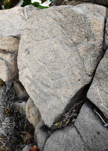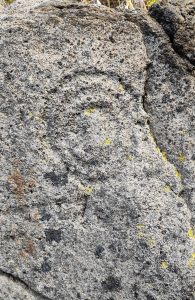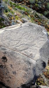 Roca 1. Mide unos 35 cm de diámetro, contiene símbolos meandriformes ejecutados mediante una técnica de picado ancho sobre la cara que mira al NO, hacia la montaña por la zona de la Punta de Los Roques. En ese lugar se produce el ocaso crepuscular de la estrella Vega (quinta estrella más brillante de nuestro cielo que no varió su posición durante la época indígena) coincidiendo con el máximo desplazamiento solar en dirección Sur: el solsticio de invierno, fecha de festividad del renacimiento del Sol celebrada en todos los tiempos pretéritos y por todos los pueblos y culturas en numerosos templos del universo.