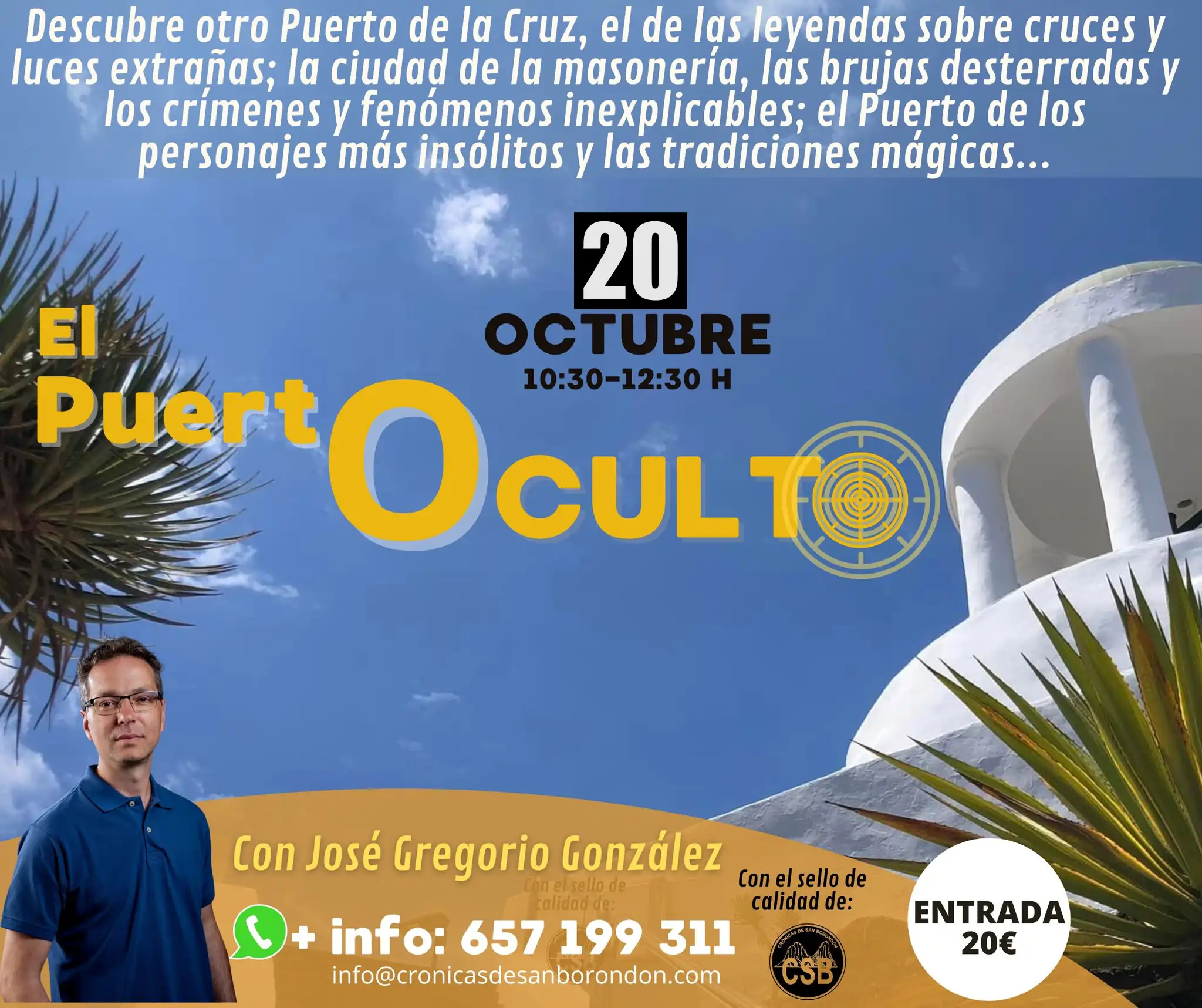 José Gregorio González, autor de Guía Mágica de Canarias, te descubrirá el otro Puerto de la Cruz, el de las leyendas y misterios que anidan bajo la acogedora ciudad turística. Un Puerto de curiosidades arqueológicas, de extrañas luminarias recorriendo sus parajes, y de fenómenos inexplicables que hoy siguen en activo. Pasea serenamente por sus calles descubriendo tradiciones mágicas, símbolos herméticos y episodios únicos sobre brujas desterradas, personajes milagreros y crímenes de novela.