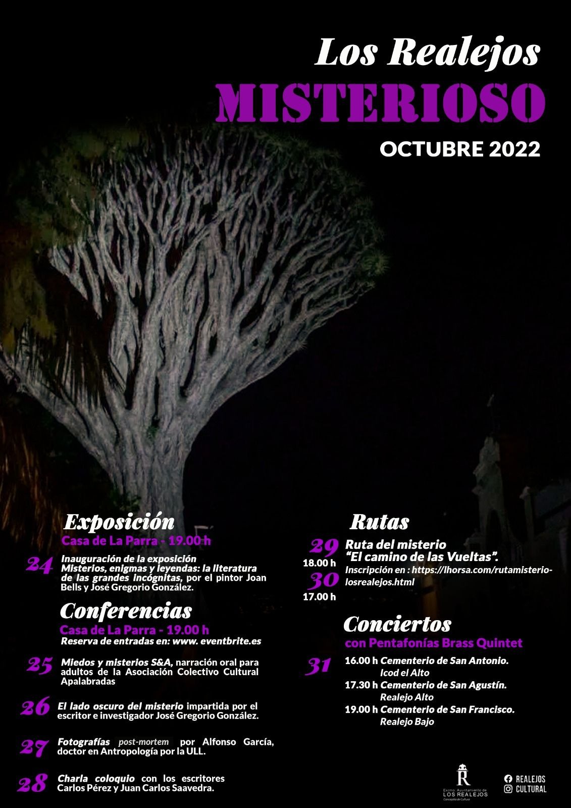 LOS REALEJOS MISTERIOSO 2022, ya está aquí! Regresa esta nueva cita con lo desconocido en el municipio de Los Realejos, un clásico que por espacio de una semana ofrece protagonismo a nuestros temas. La Concejalía de Cultura del ayuntamiento realejero nos ofrece la exposición CANARIAS OCULTA, interesantes conferencias de la mano de un elenco extraordinario de ponentes, un paseo con misterio por el Camino de las Vueltas y música para finalizar otro mes de octubre mágico.