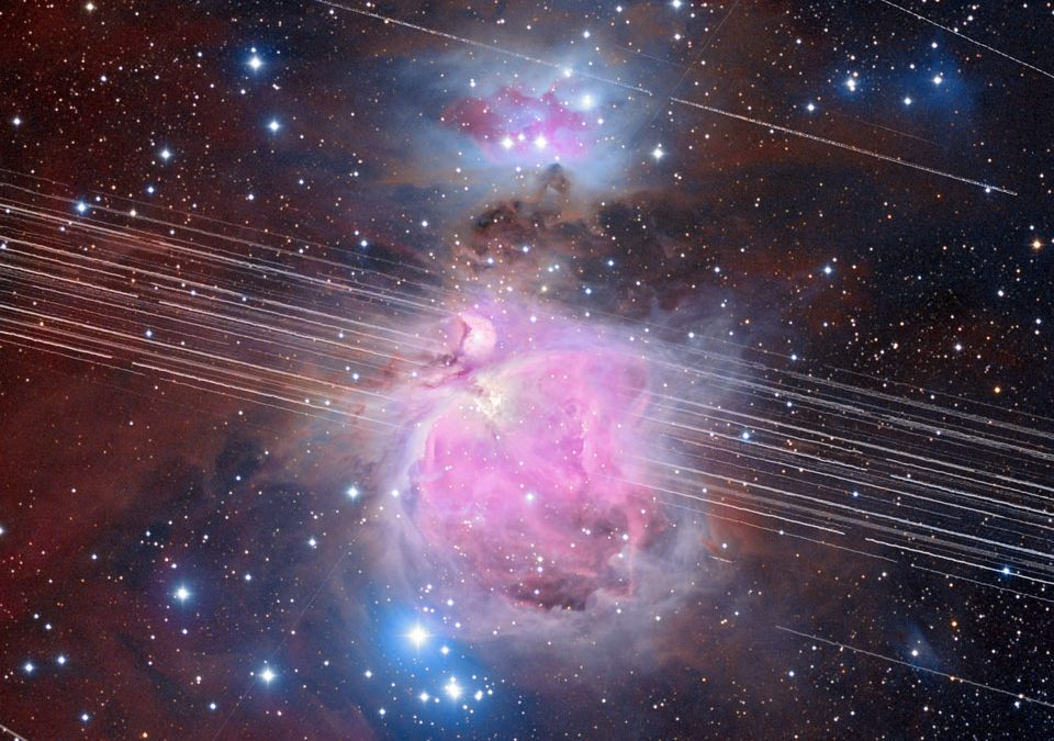Las rayas a través de Orión no son de Starlink en este caso, sino de satélites en órbita geosincrónica alta. La imagen presentada, tomada en diciembre de 2019, es una combinación digital de más de 65 exposiciones de 3 minutos, con algunas imágenes tomadas para resaltar el fondo de la Nebulosa de Orión, mientras que otras muestran los satélites que pasan mientras transitan por su órbita. Un ejemplo quizá de lo que está por venir, dificultando la labor de los astrónomos.